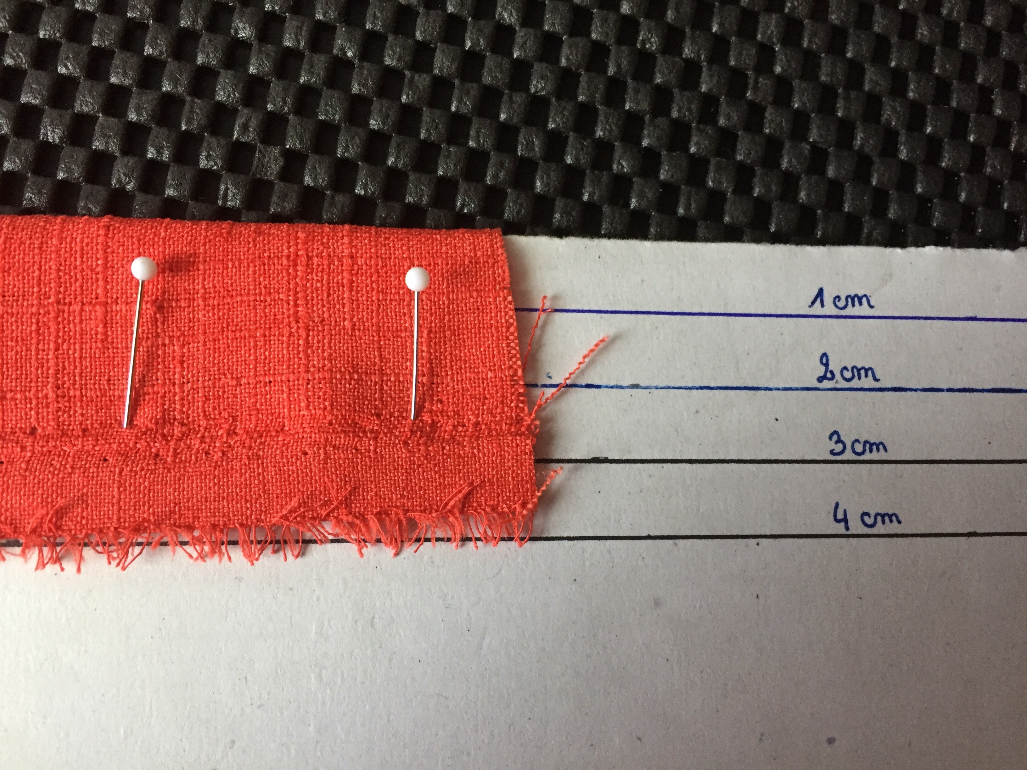 Grâce aux aiguilles que je pique dans le carton (et parfois jusque dans la table à repasser), le tissu ne bouge pas et mon pli est nickel !