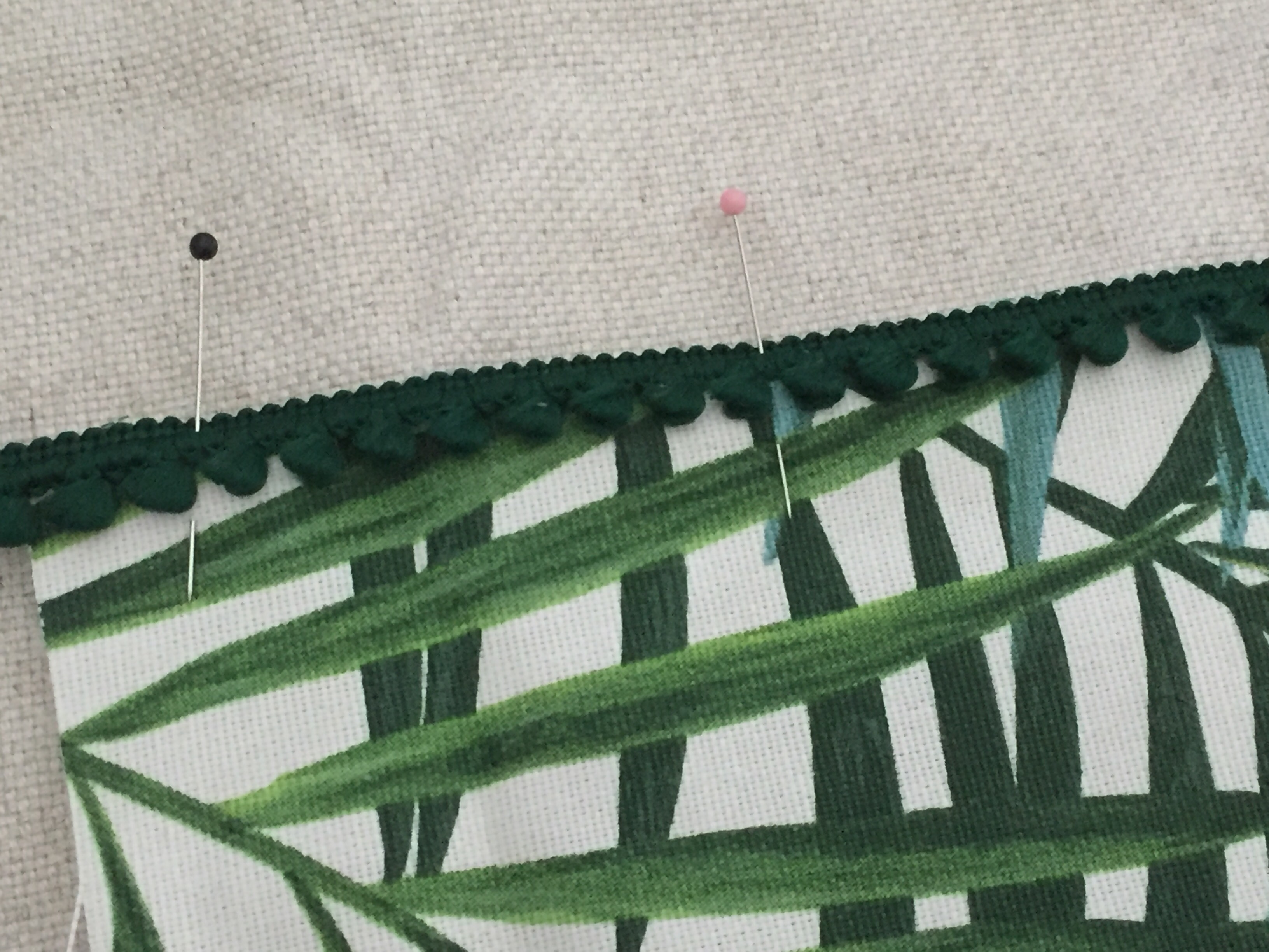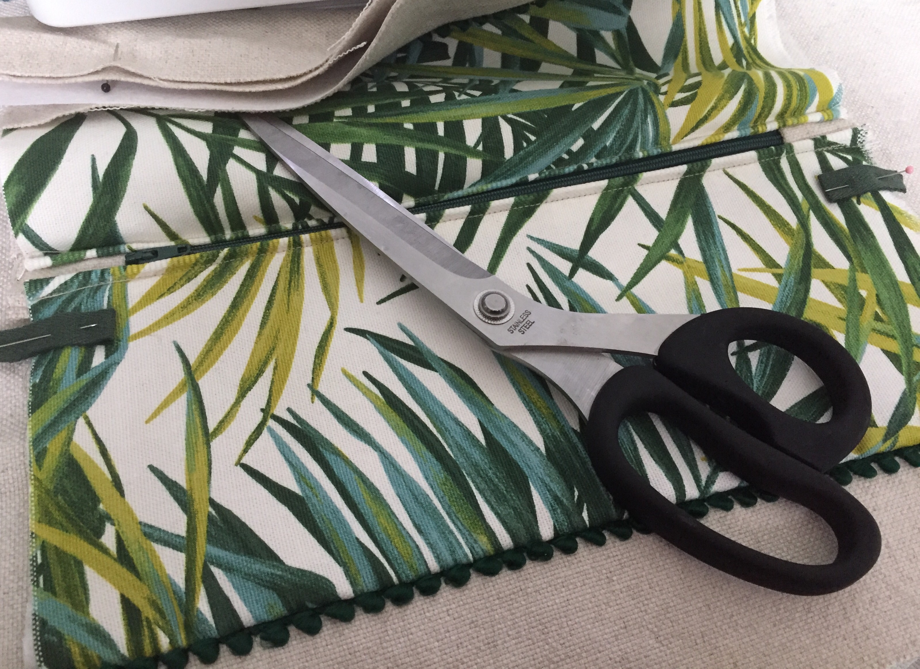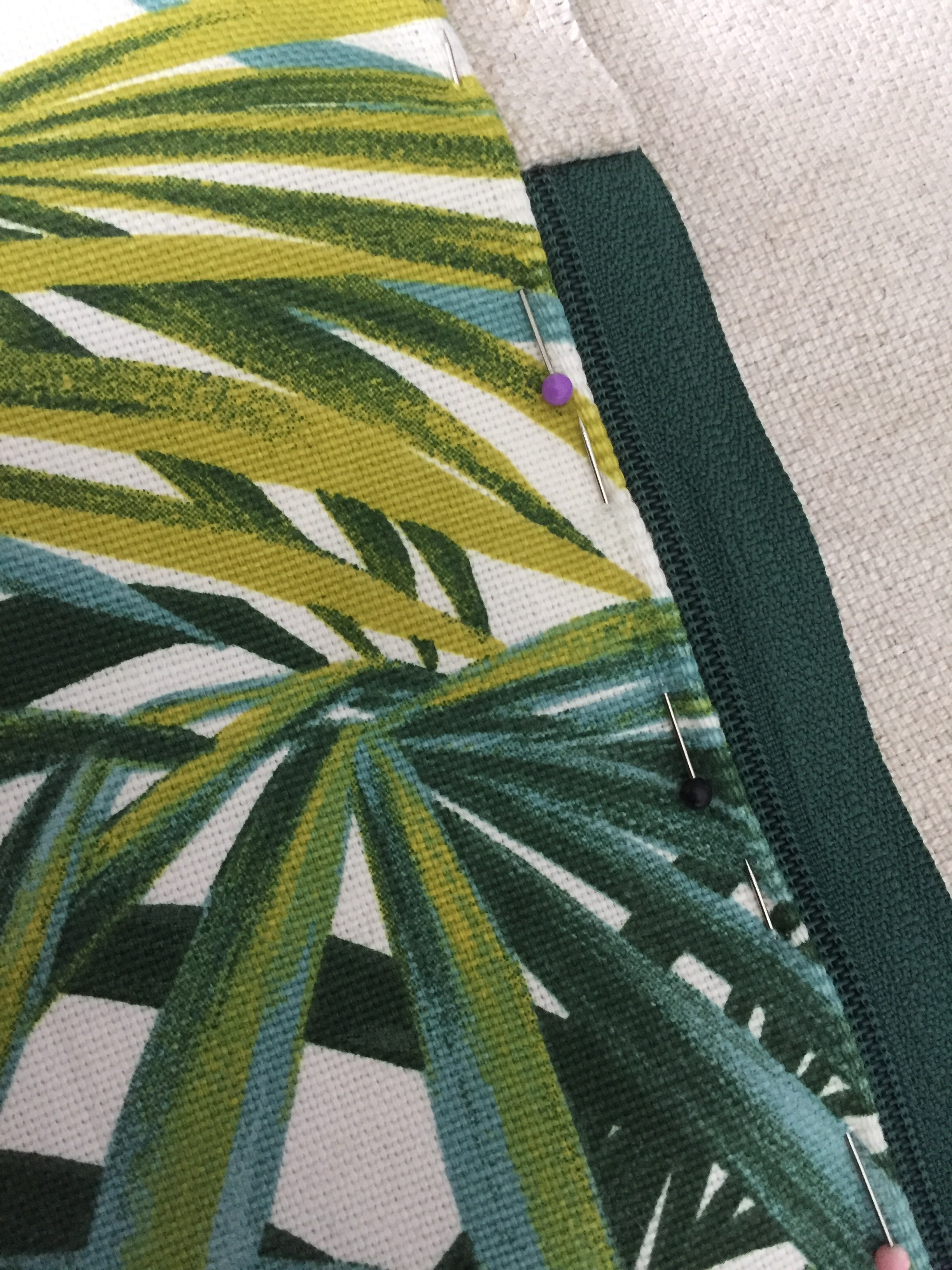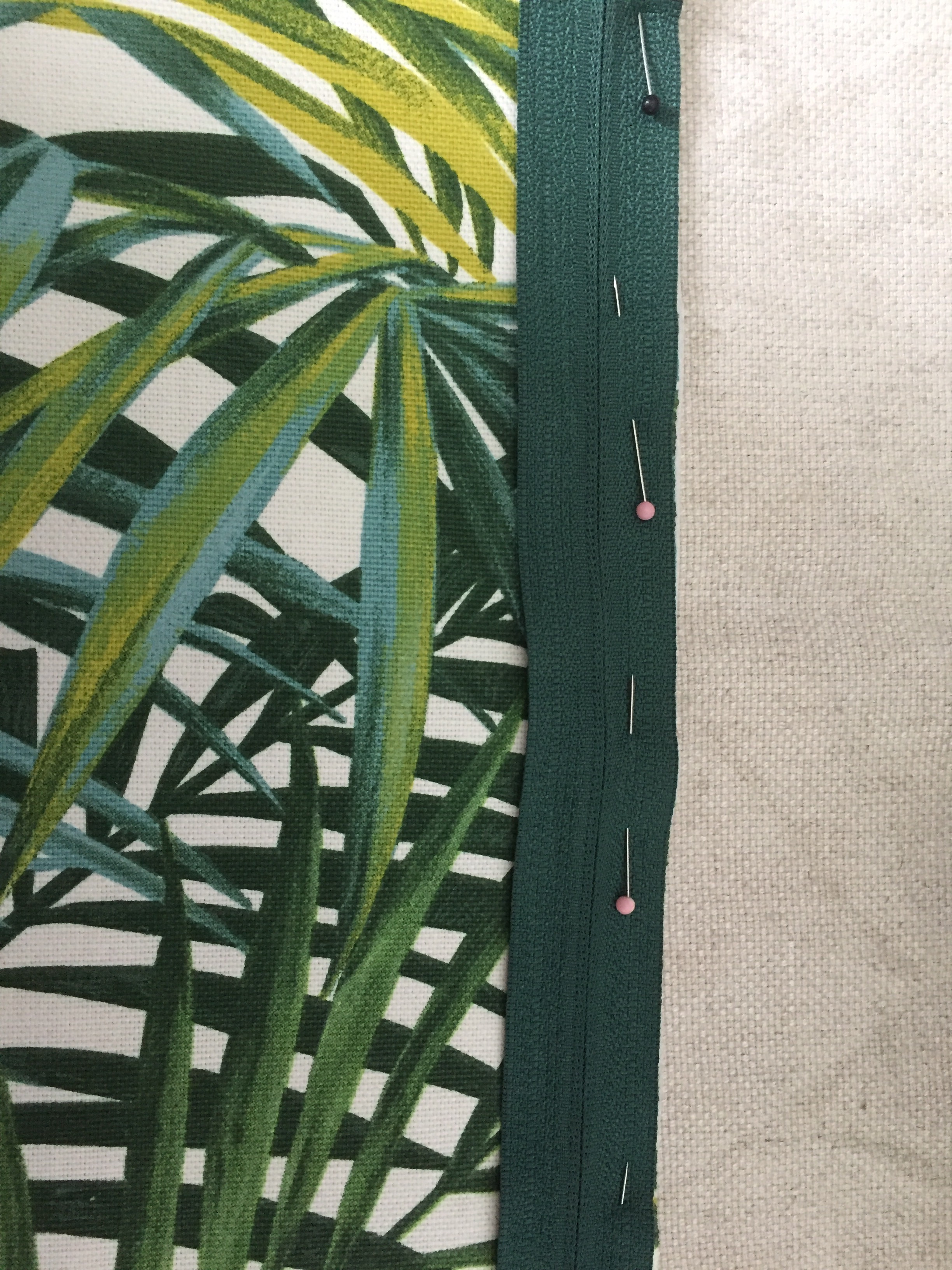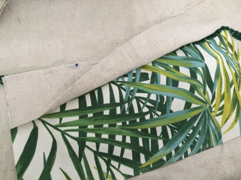 Retourner votre ouvrage et replier le tissu supérieur le long de la glissière. Maintenir avec des aiguilles puis surpiquer au point droit.