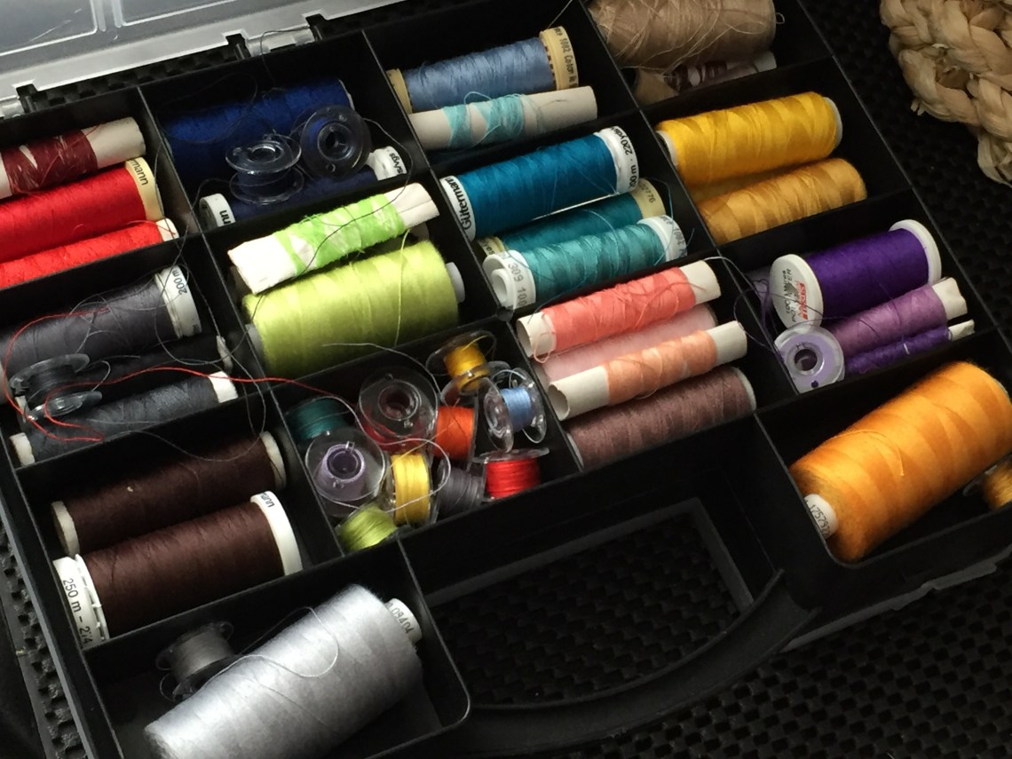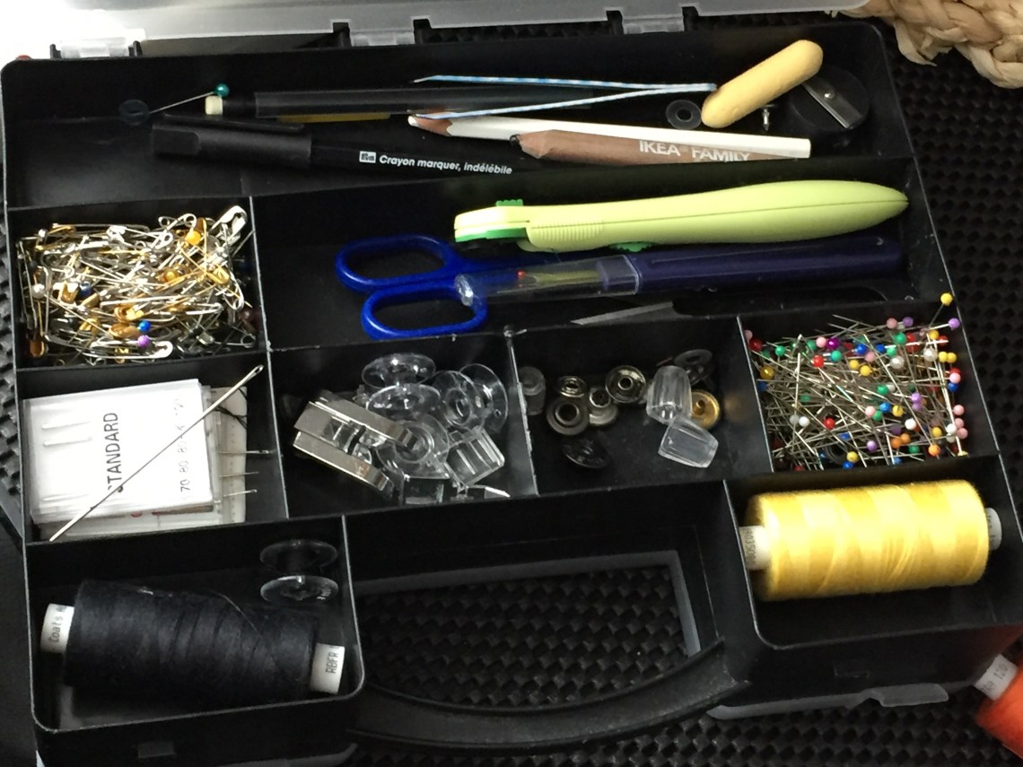 Comme pour les bobines et les canettes, j’ai regroupé mon nécessaire de couture dans une boîte à compartiments. Ça me permet aussi de transporter mon matériel plus facilement