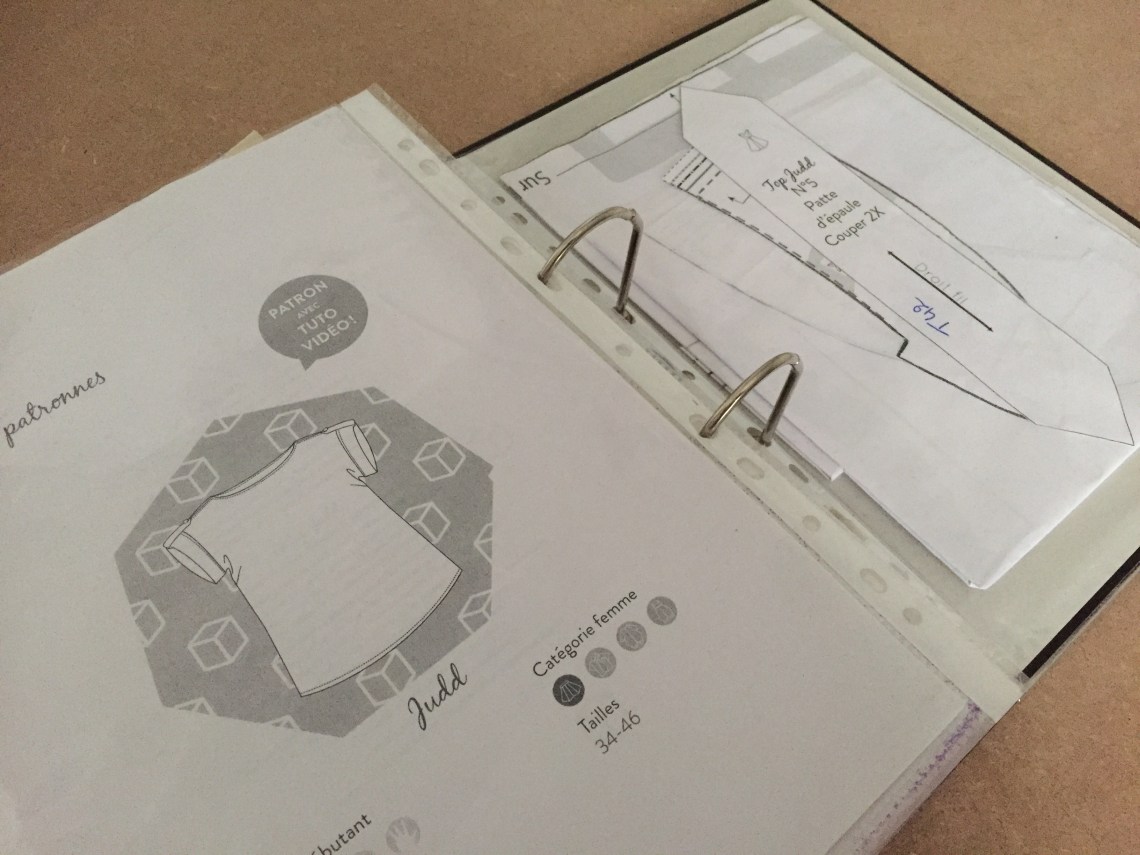 J’ai choisi de les ranger dans des pochettes plastiques regroupées dans plusieurs classeurs. J’ai pris l’habitude de mettre la note explicative et les pièces du patron ensemble. Je les sépare par des intercalaires de couleur en fonction qu’il s’agit d’un accessoire, d’une robe ou d’un haut.