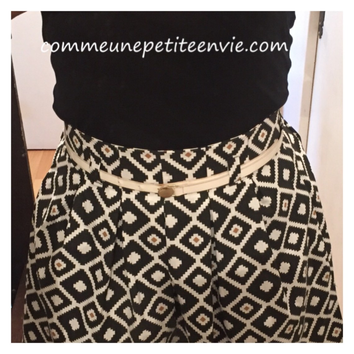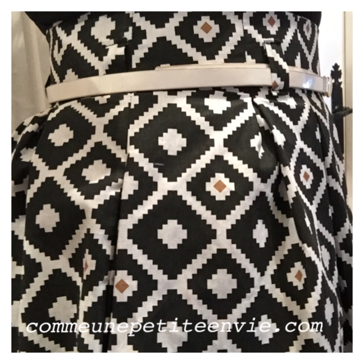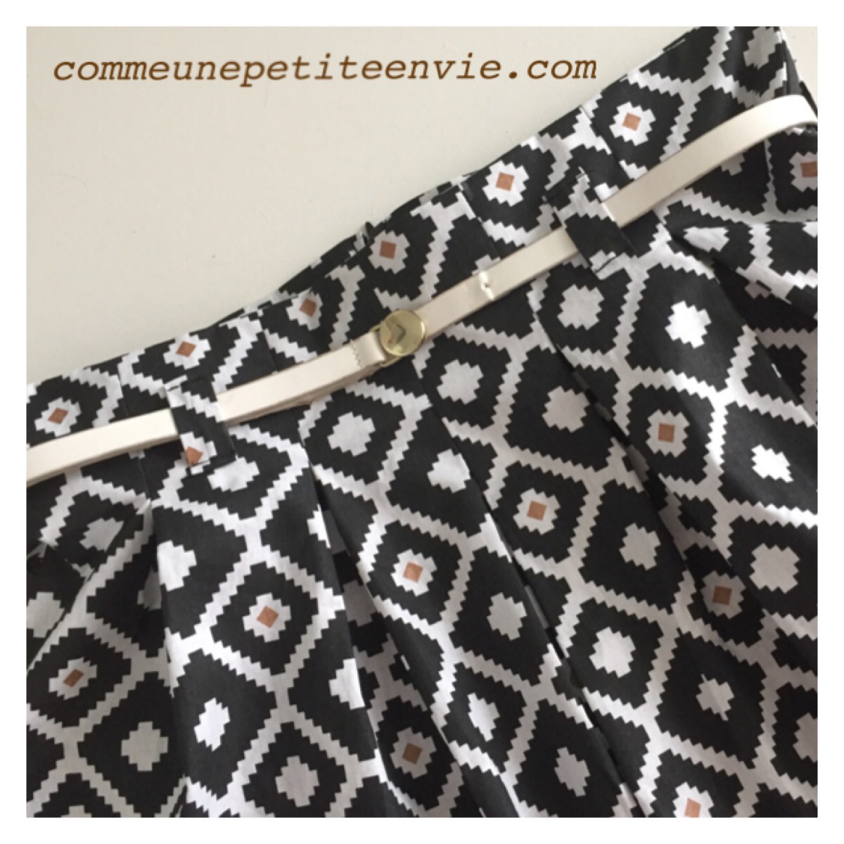 Revenons à la jupe. Il s’agit d’un modèle taille haute à plis plats, muni de poches. Le patron comprend 2 versions : une avec passepoil sur la partie basse et l’autre sans.