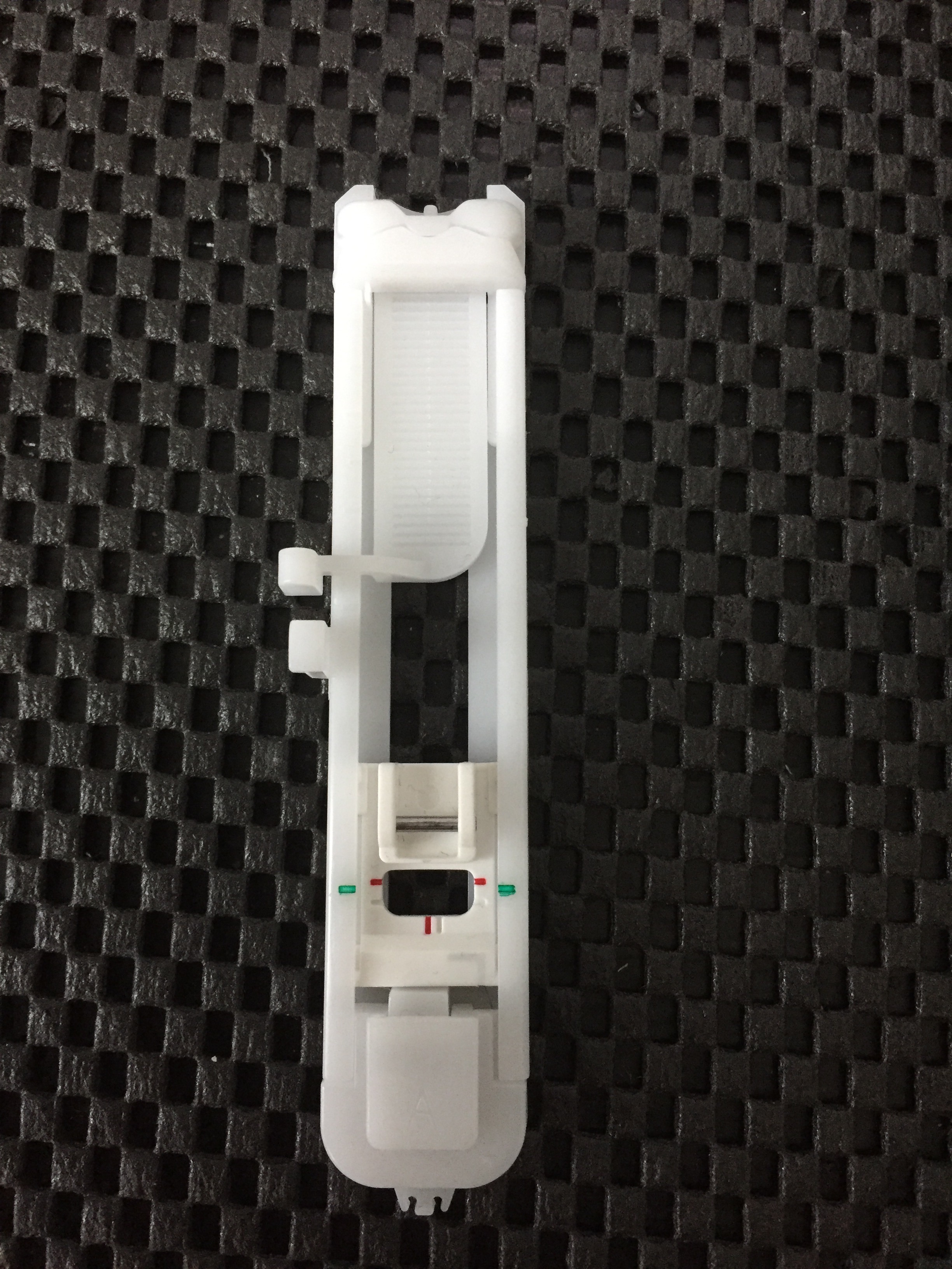 Placez le tissu en alignant la partie avant du repère de la boutonnière sur les repères rouges situés sur les côtés du pied pour boutonnière, puis abaissez le levier du pied de biche