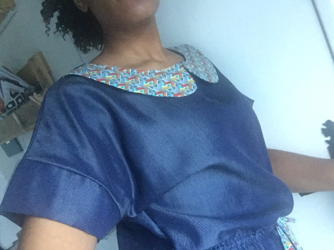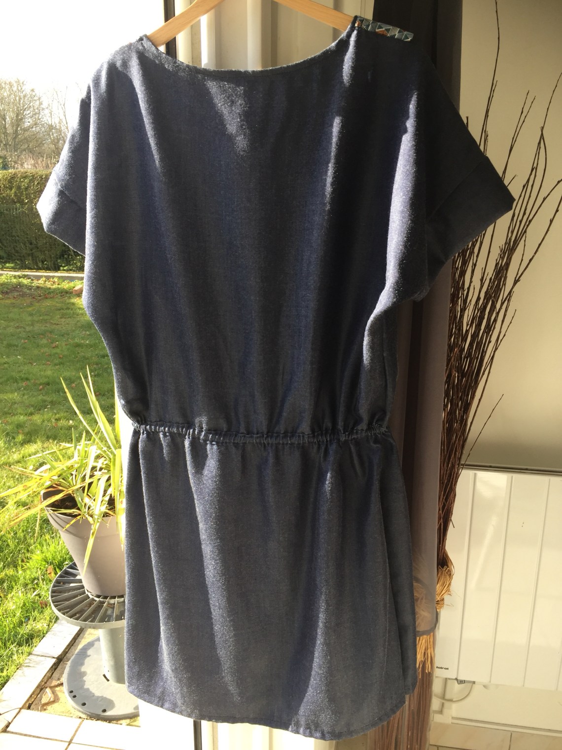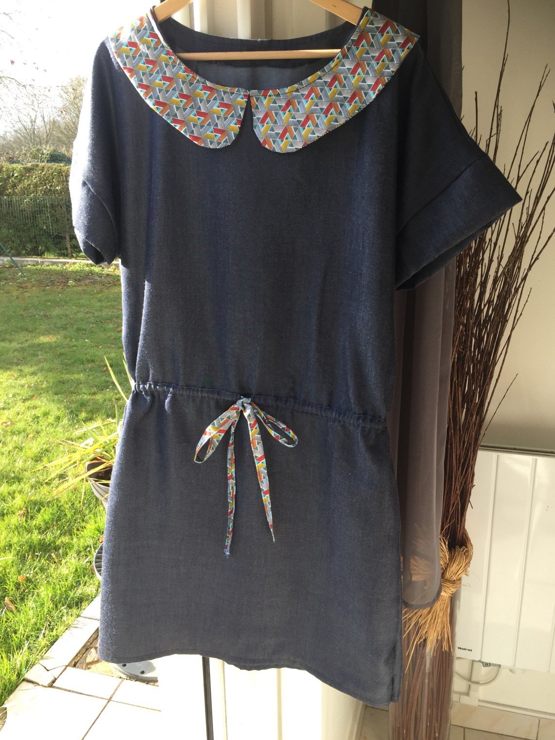 Et je me retrouve avec une robe droite, montée d’un col claudine et d’une coulisse. En jean, oui ! mais dont la couleur a déteint sur mes mains