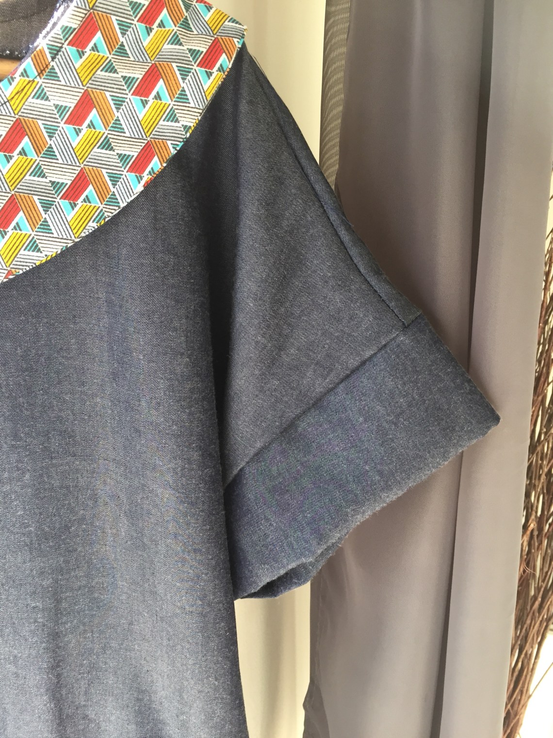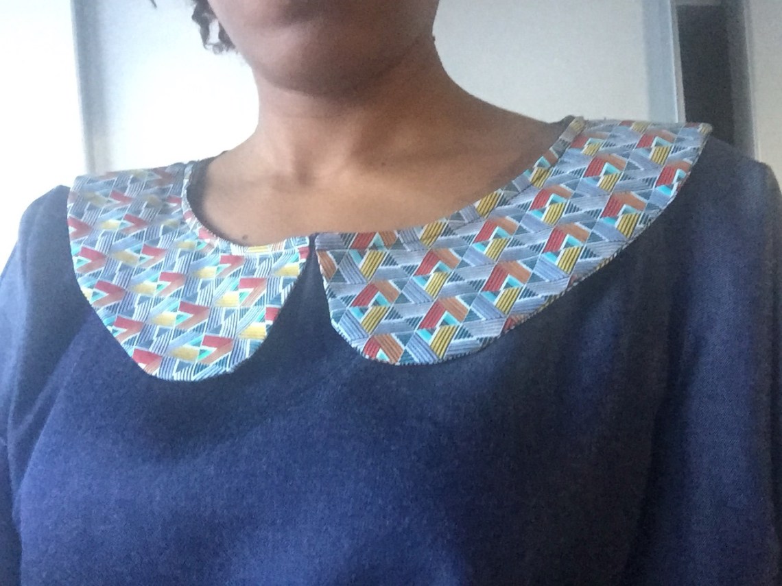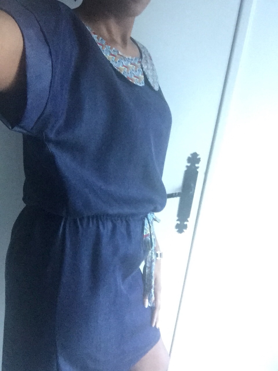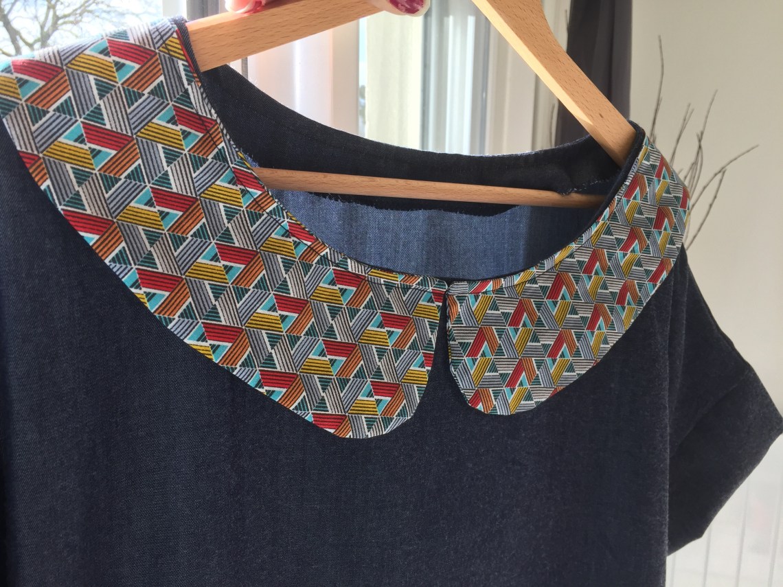 Et je me retrouve avec une robe droite, montée d’un col claudine et d’une coulisse. En jean, oui ! mais dont la couleur a déteint sur mes mains