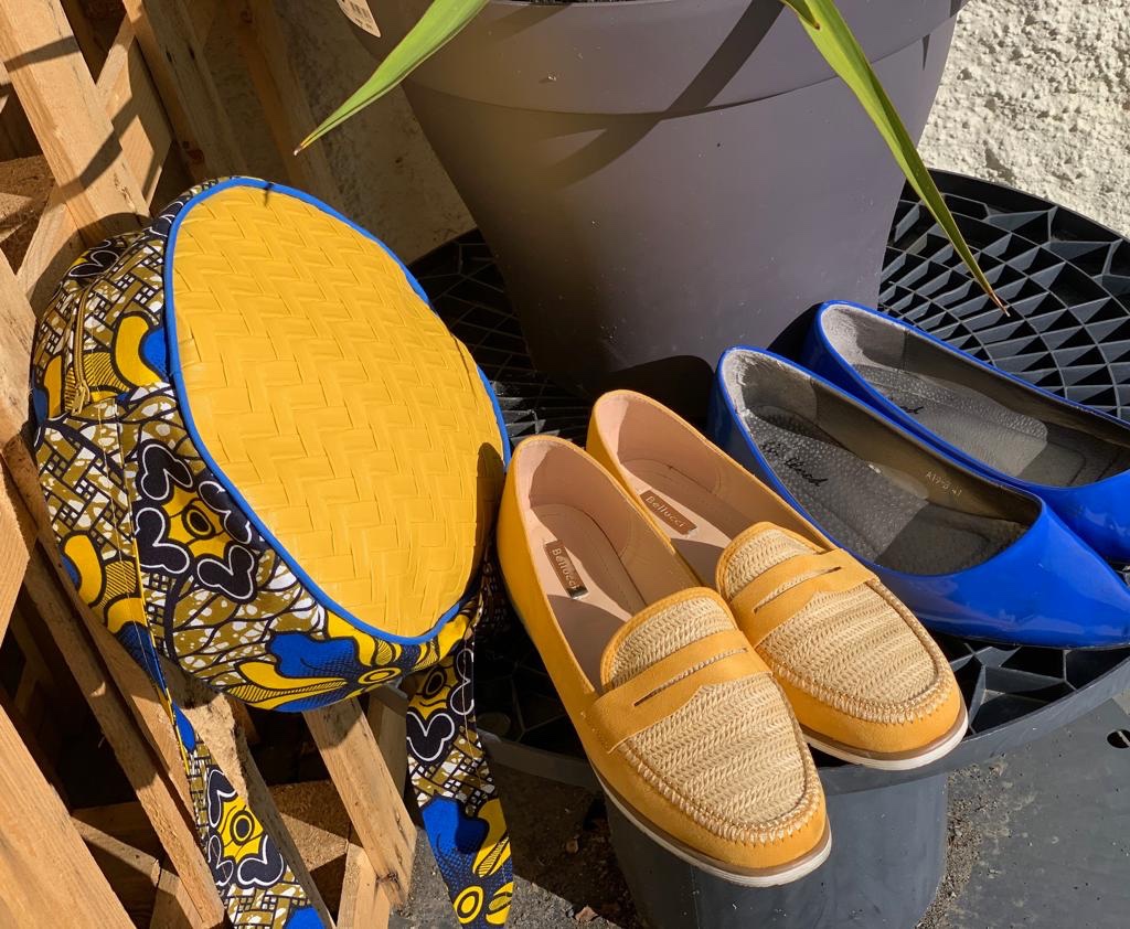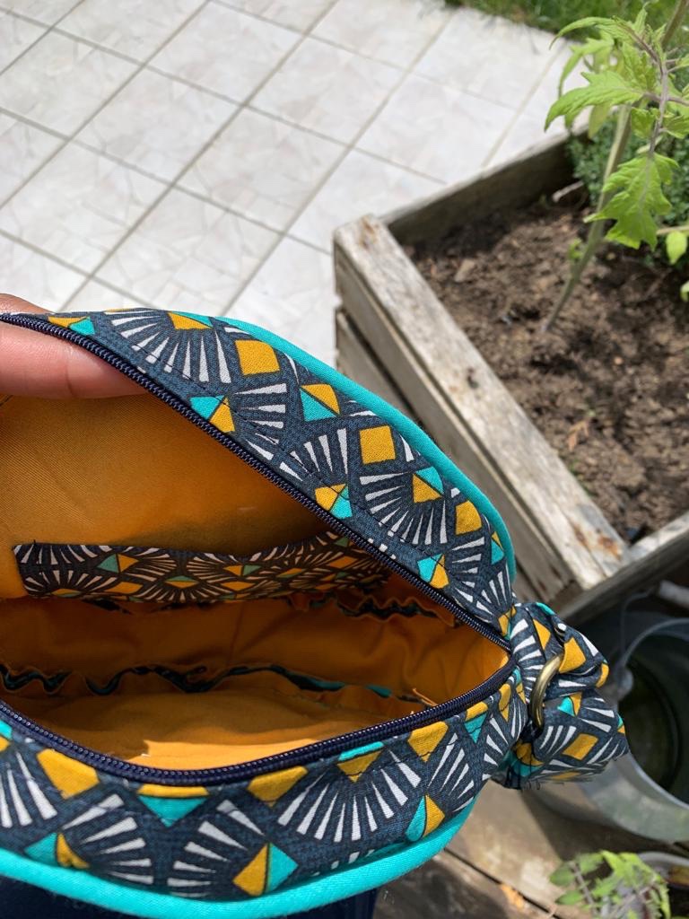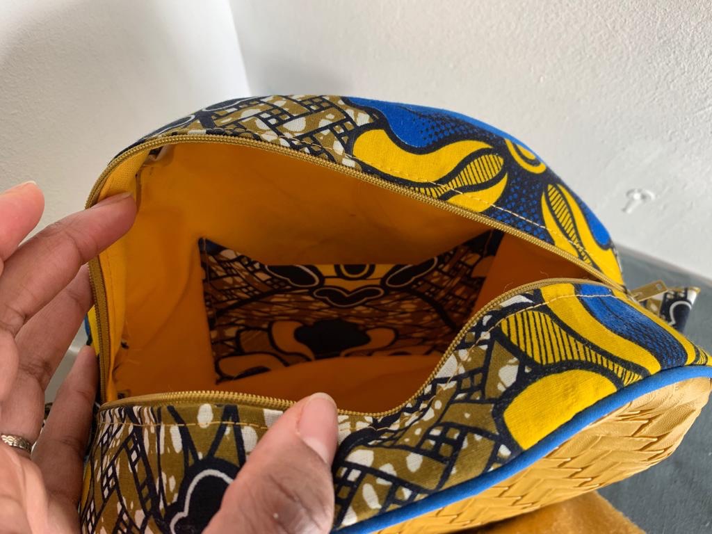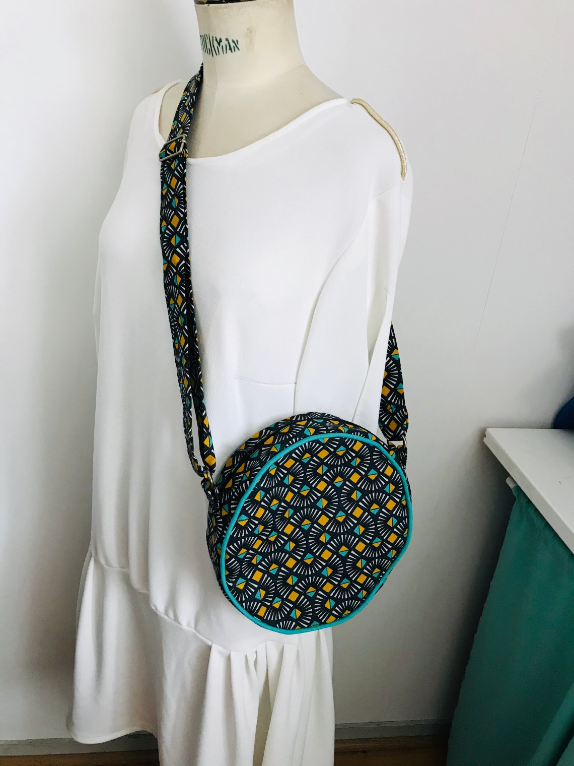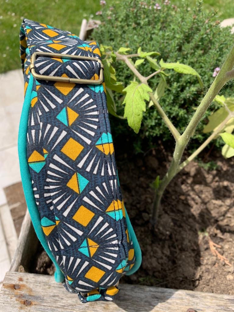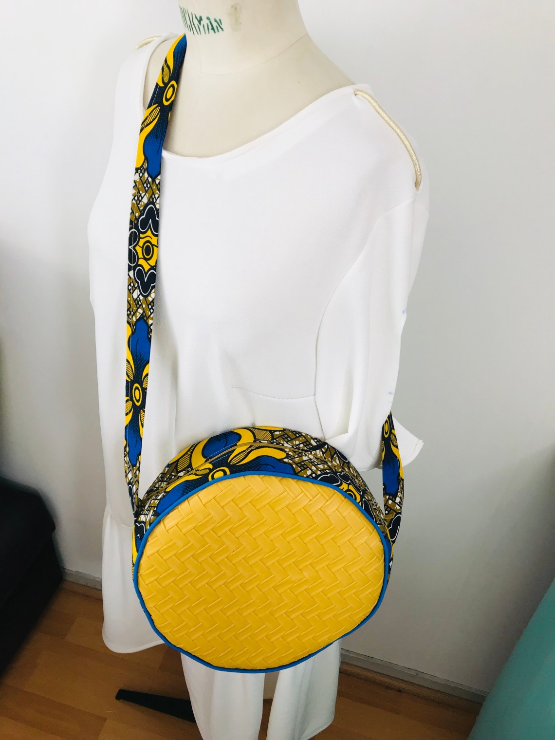 J’avais besoin d’un sac pour à assortir avec les chaussures plates du moment. J’ai donc opté pour un simili cuir jaune et pour un wax kaki, jaune et bleu.