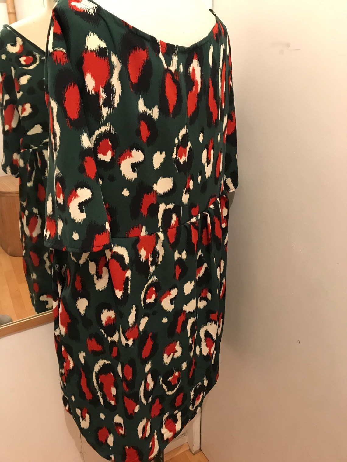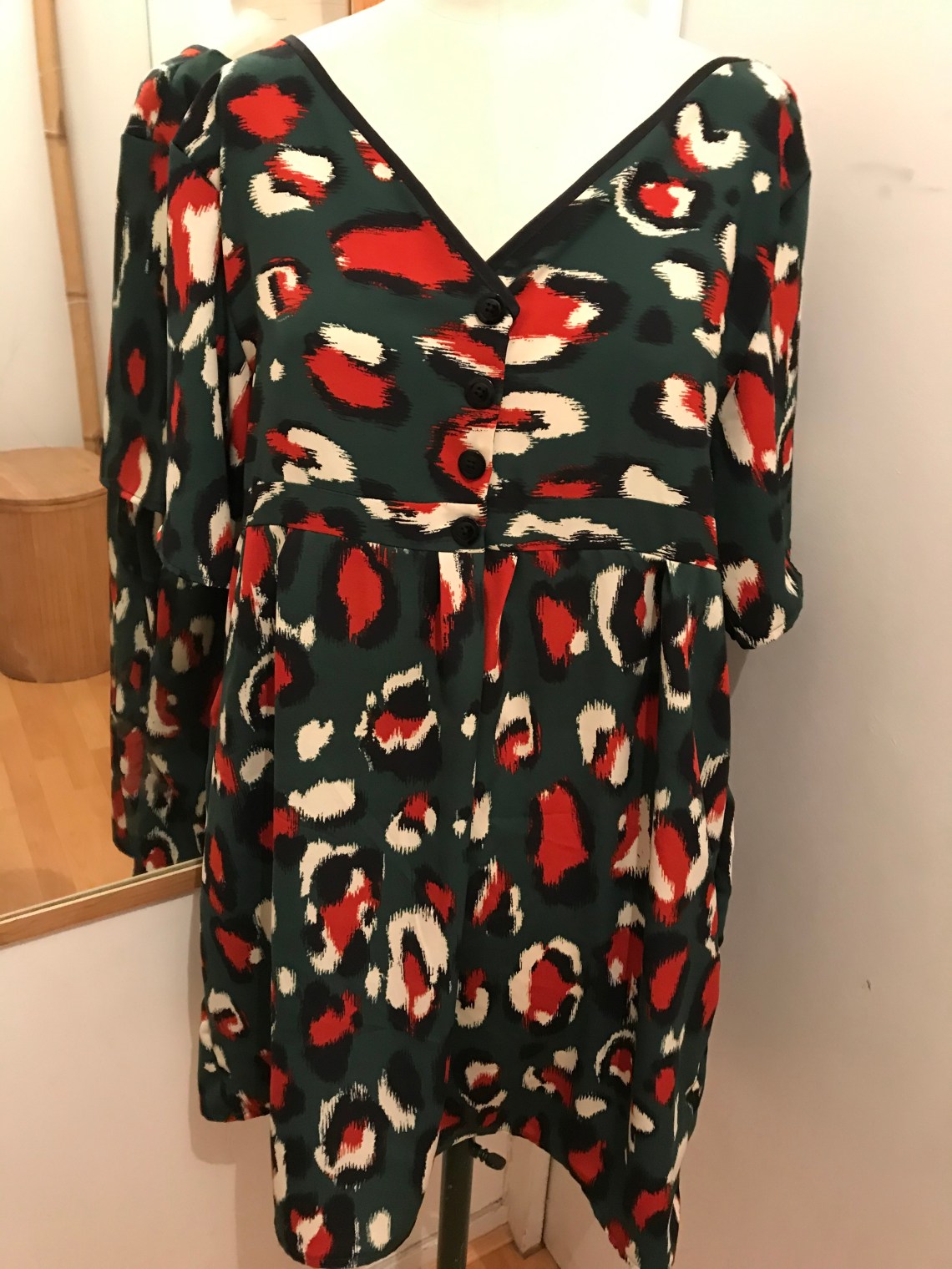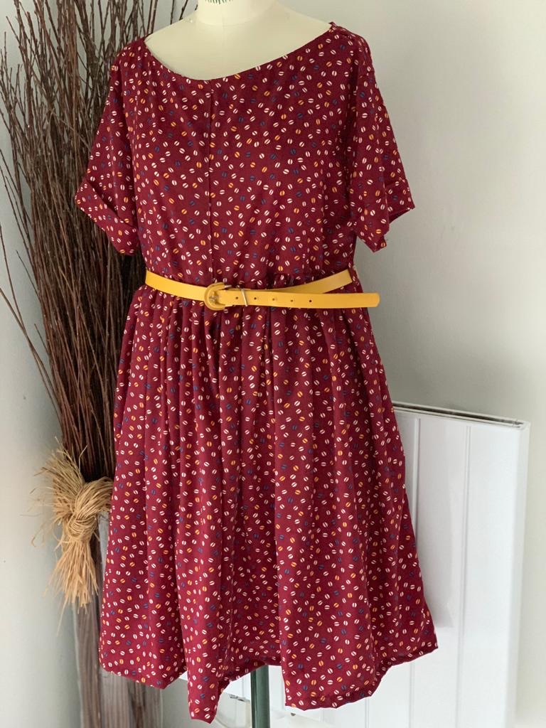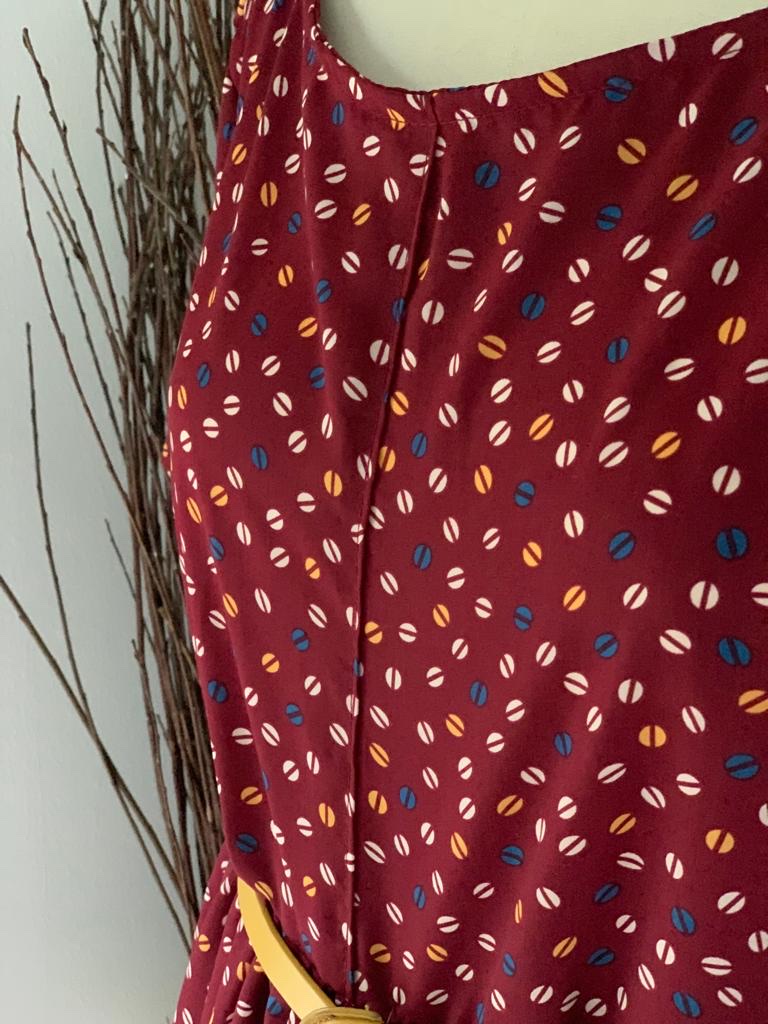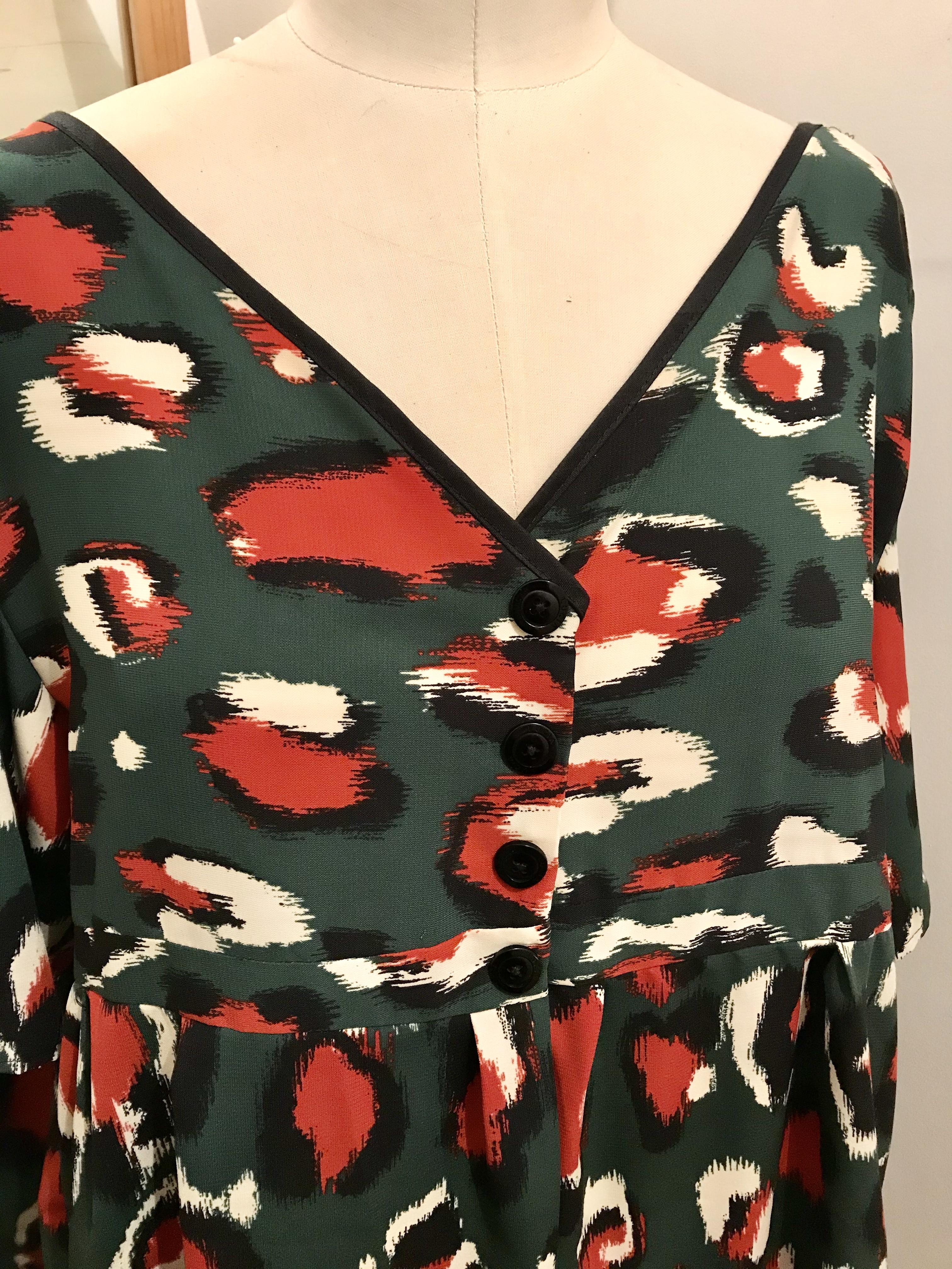 J’ai coupé un col V, réduit la largeur du haut (pour un modèle plus ajusté), ajouté un biais à l’encolure et 4 boutons au niveau du buste. J’ai également réduit la largeur de la jupe et divisant par deux la largeur préconisé par le patron.