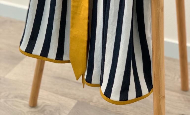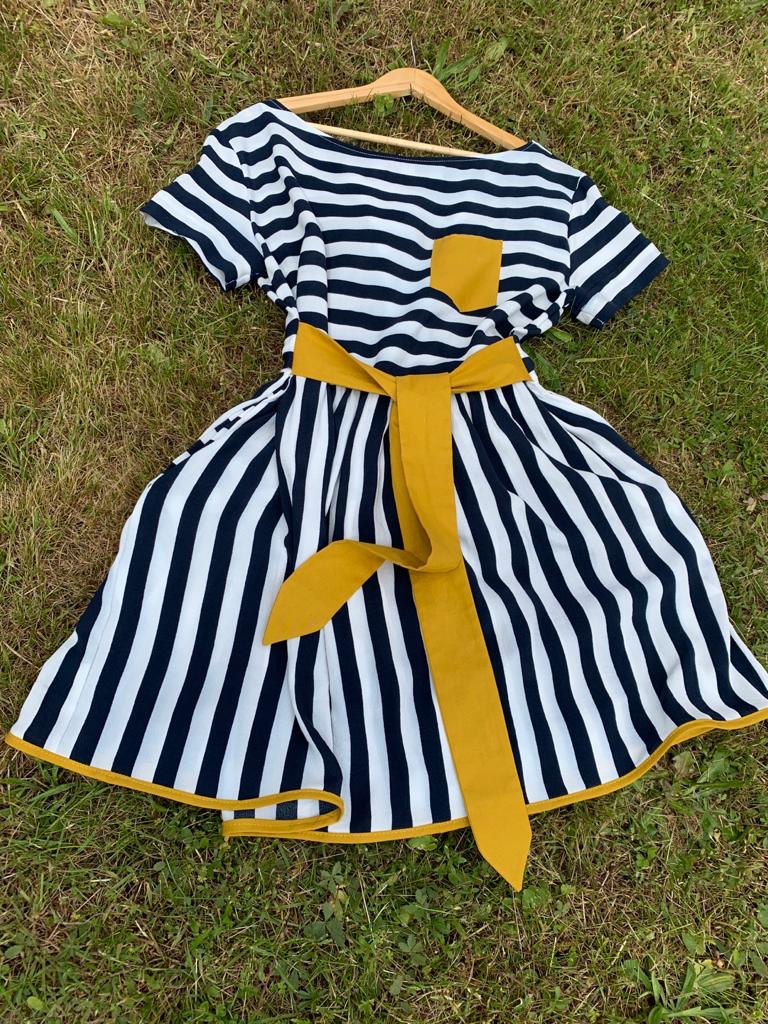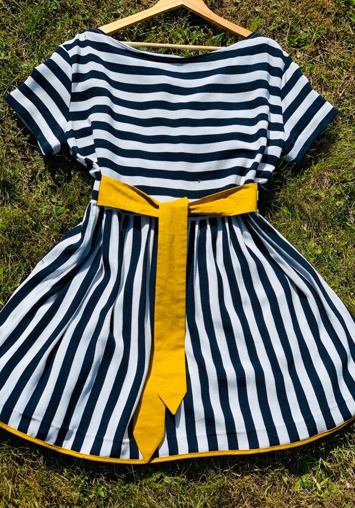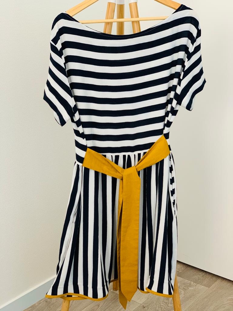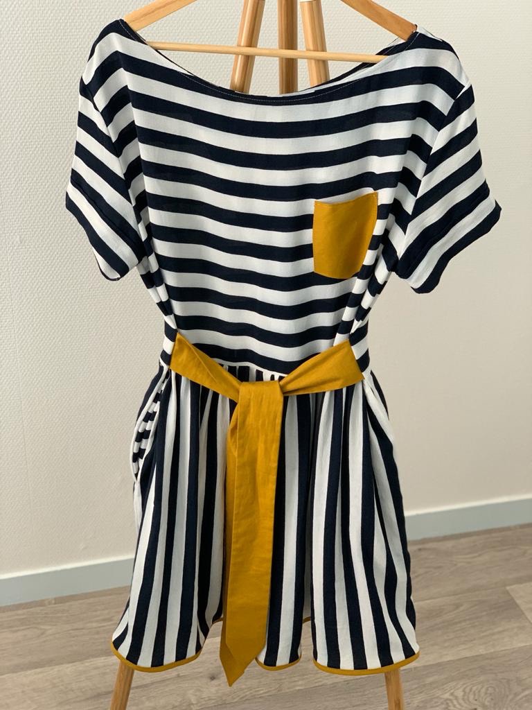 Le patron de base prévoit des passants et une ceinture amovible. Pour ma version, j’ai assemblé la ceinture au haut de la robe. Et comme j’aime l’association des couleurs marinières avec le jaune, j’ai chosi un coton jaune curry pour la réaliser.
