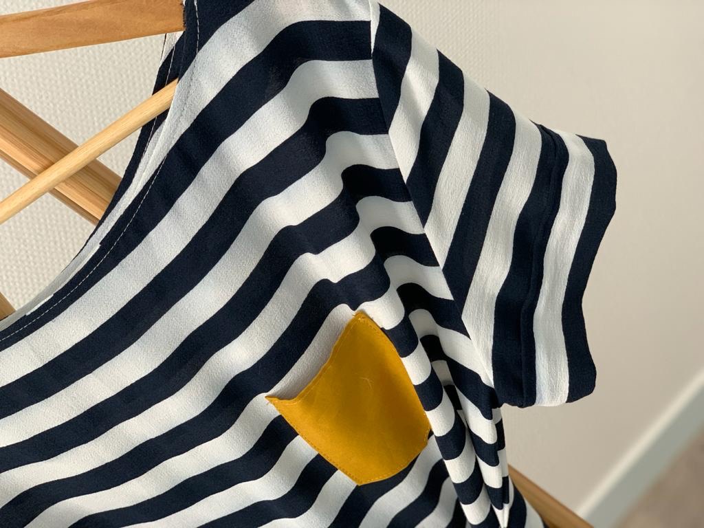 Un mot sur le sens des rayures : je ne me suis pas trompée. Il s’agit d’un effet de style pour casser la monotonie des rayures 😉.