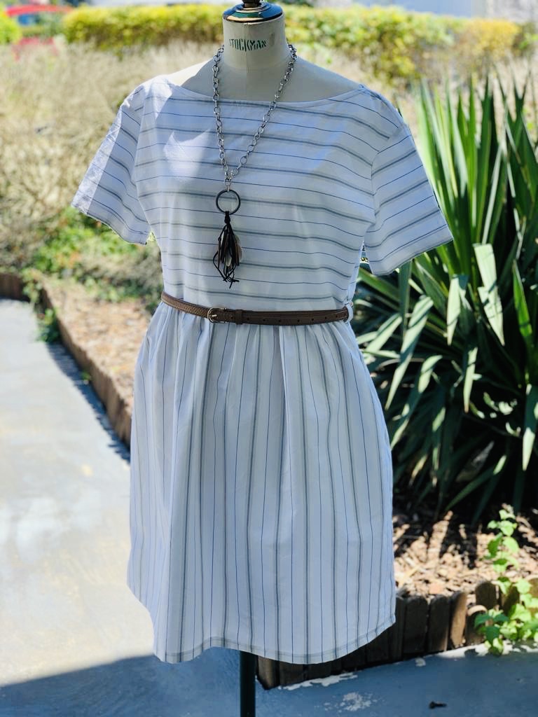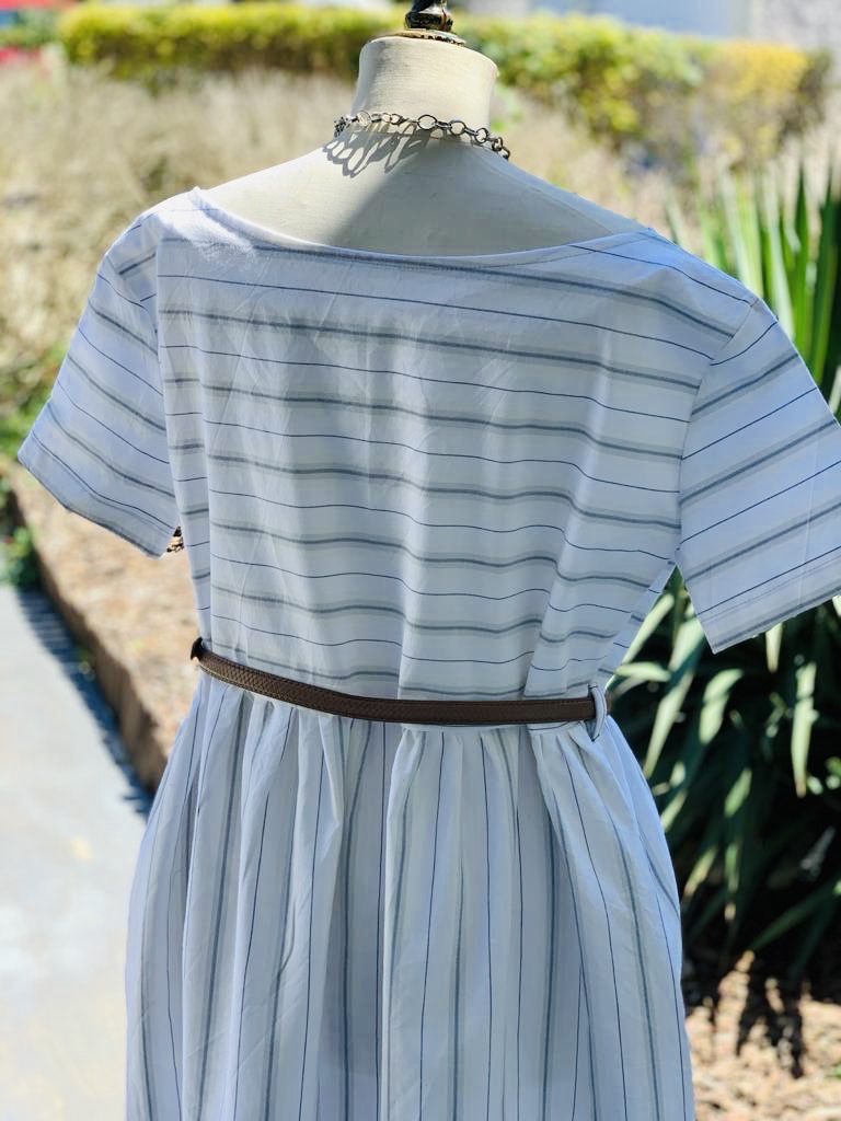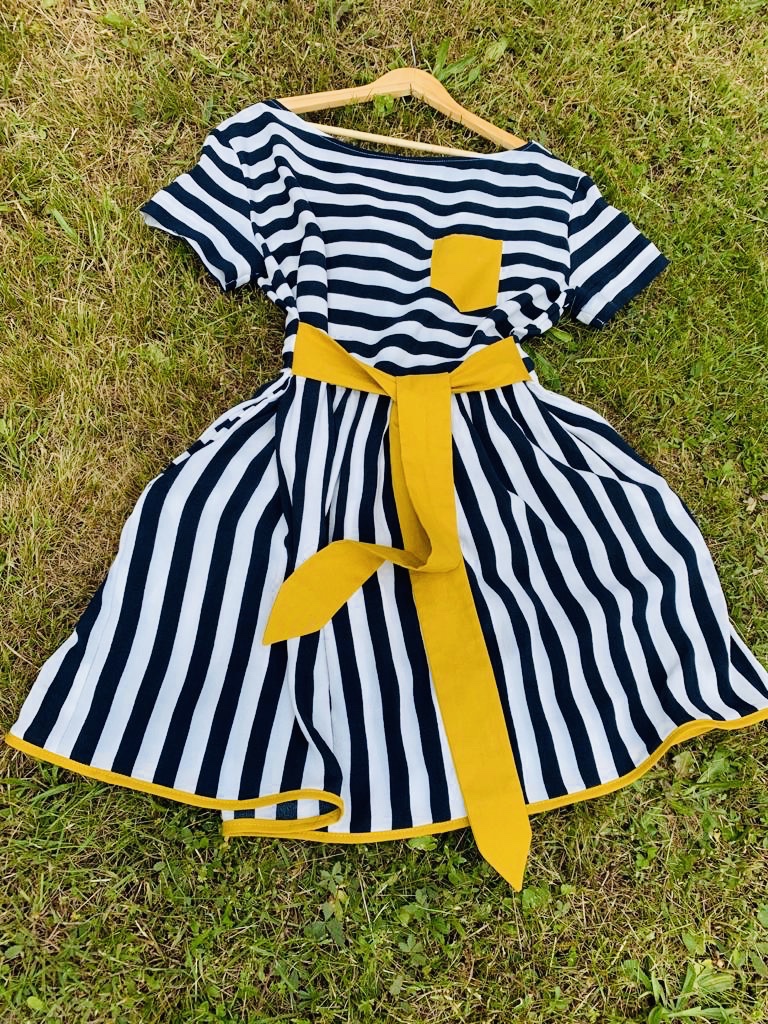 Pour éviter les raccords d’une part et donner du style à mes tenues à rayures, j’ai pris l’habitude de coudre le haut et le bas de mes robes à rayures dans des sens différents : à l’horizontale en haut et à la verticale pour le bas.