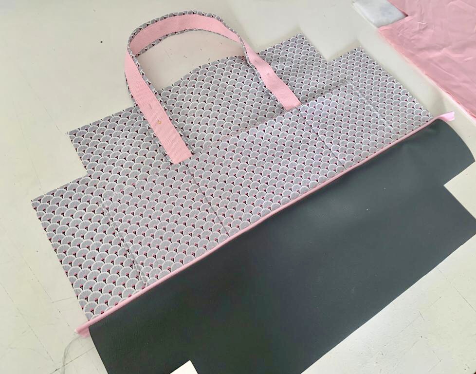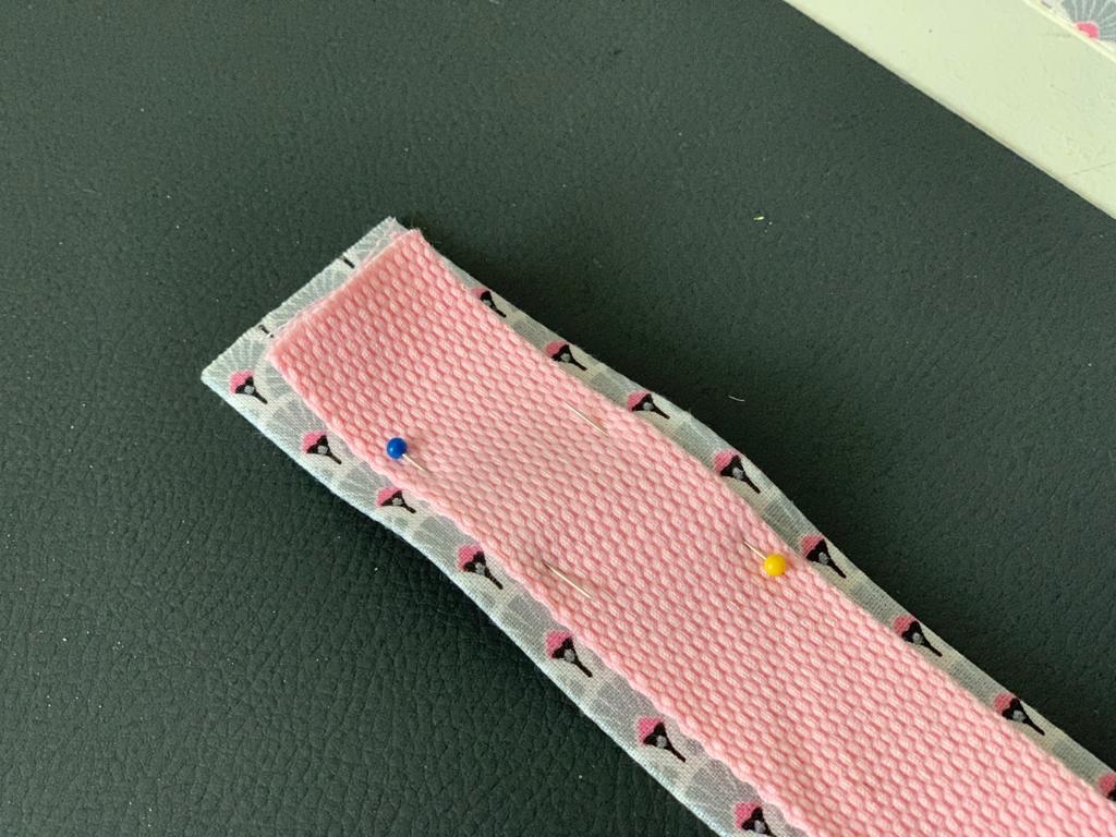 Pour les anses, ne trouvant pas la largeur souhaitée, j’ai confectionné des anses avec le tissu principal de 4cm de largeur. Je les ai thermocollées et j’ai cousu par dessus la sangle de 3cms.