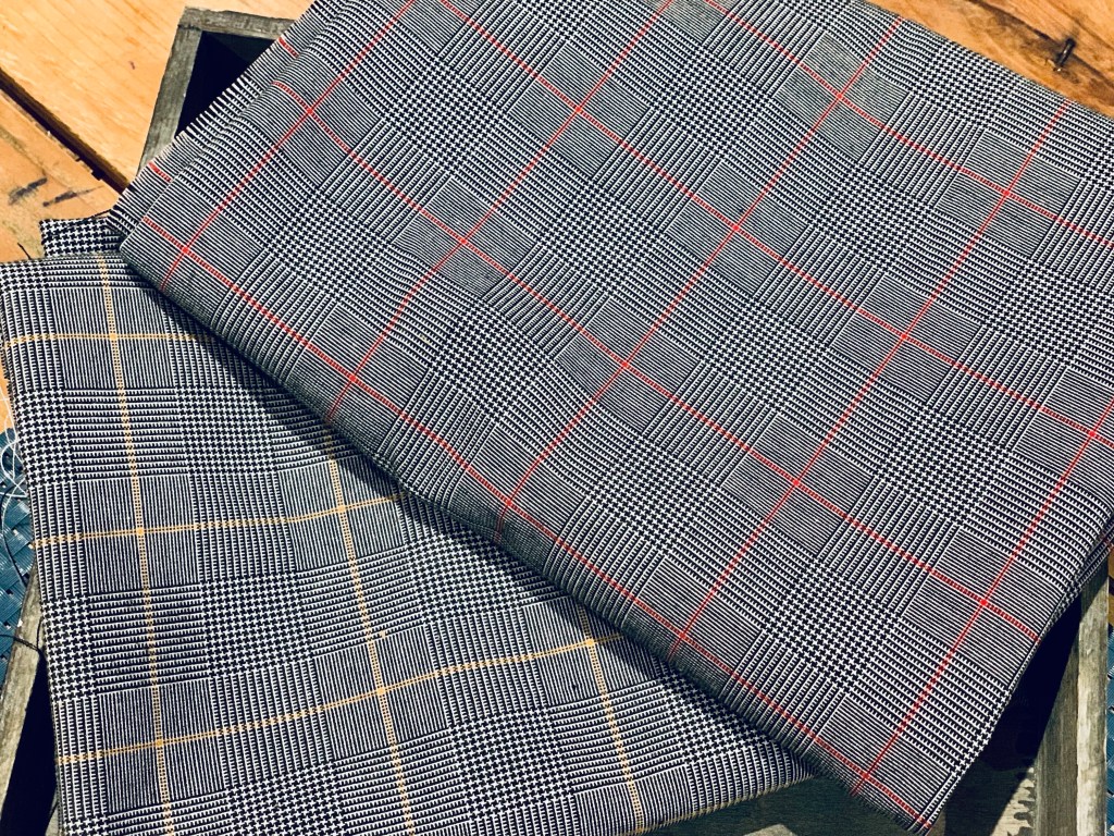 Et pour couronner le tout, j’avais le choix de la couleur. J’ai donc choisi 2 fois 1m (en 150cm) de prince de Galles, l’un à rayures rouges et l’autre à rayures jaunes.