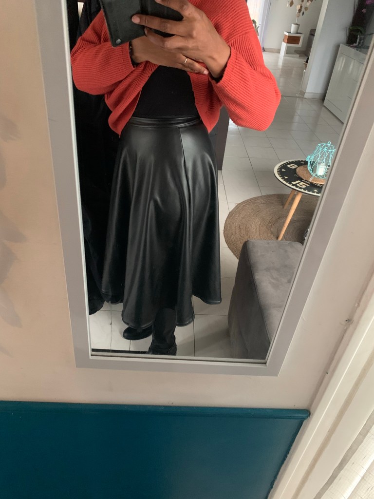 Je me rends compte plus de deux mois après l’avoir cousue que je ne vous ai pas parlé de ma jupe midi en simili cuir.