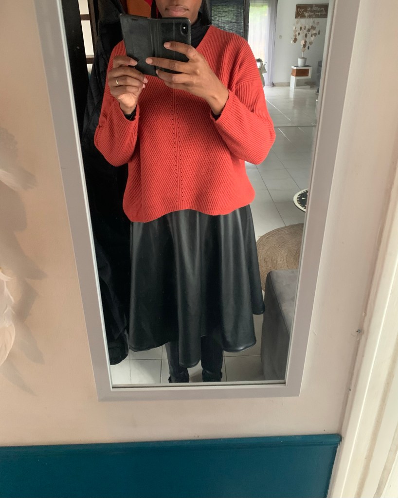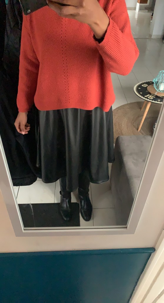 Je dois reconnaître que je suis assez fan de cette jupe. Je la porte aussi bien avec des tennis et une veste en jean, qu’avec des bottes à talons et une veste cintrée ou un pull loose.