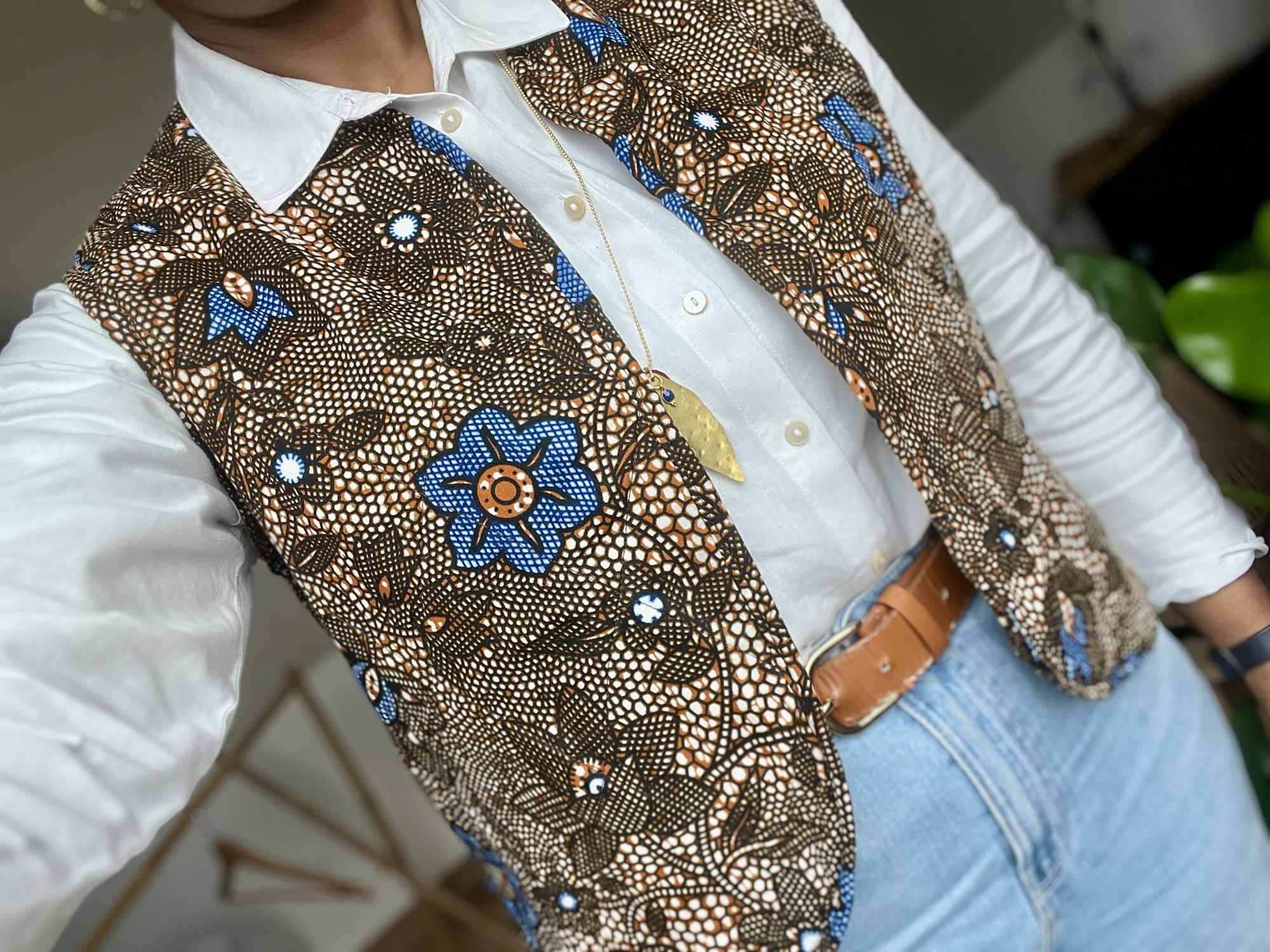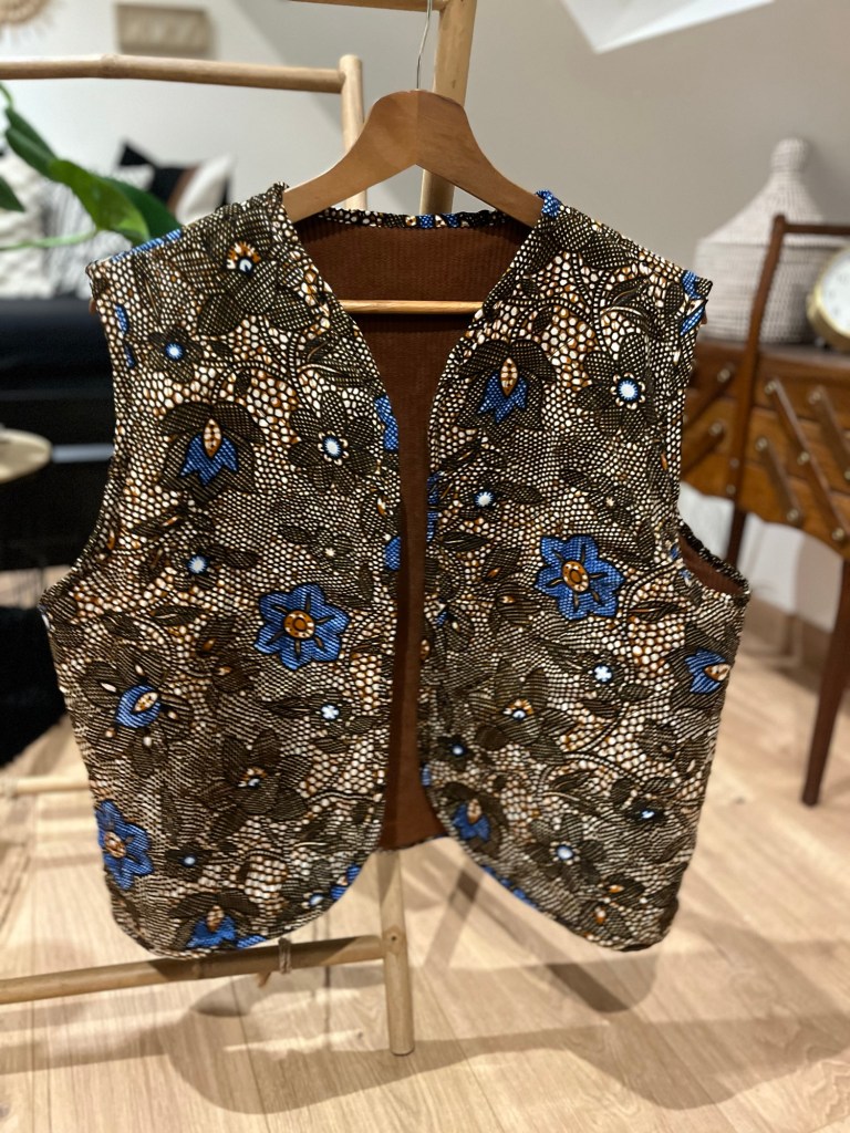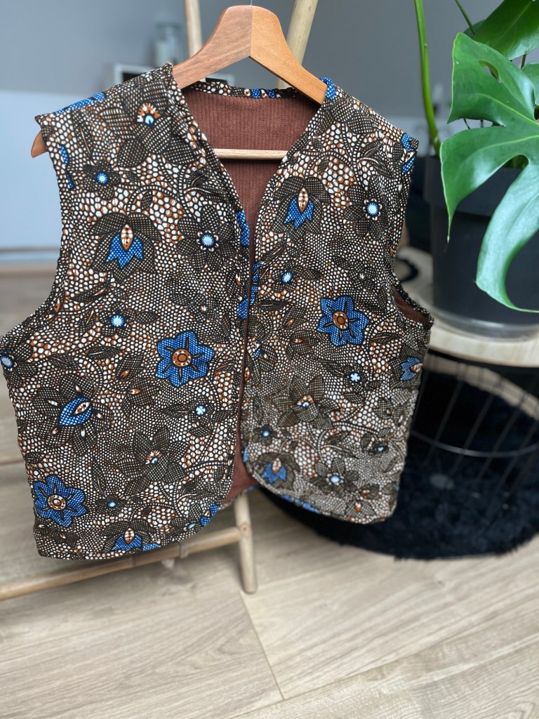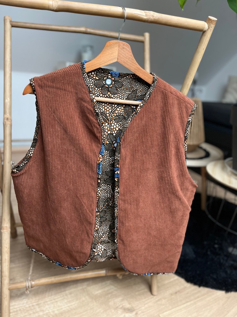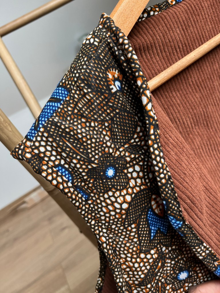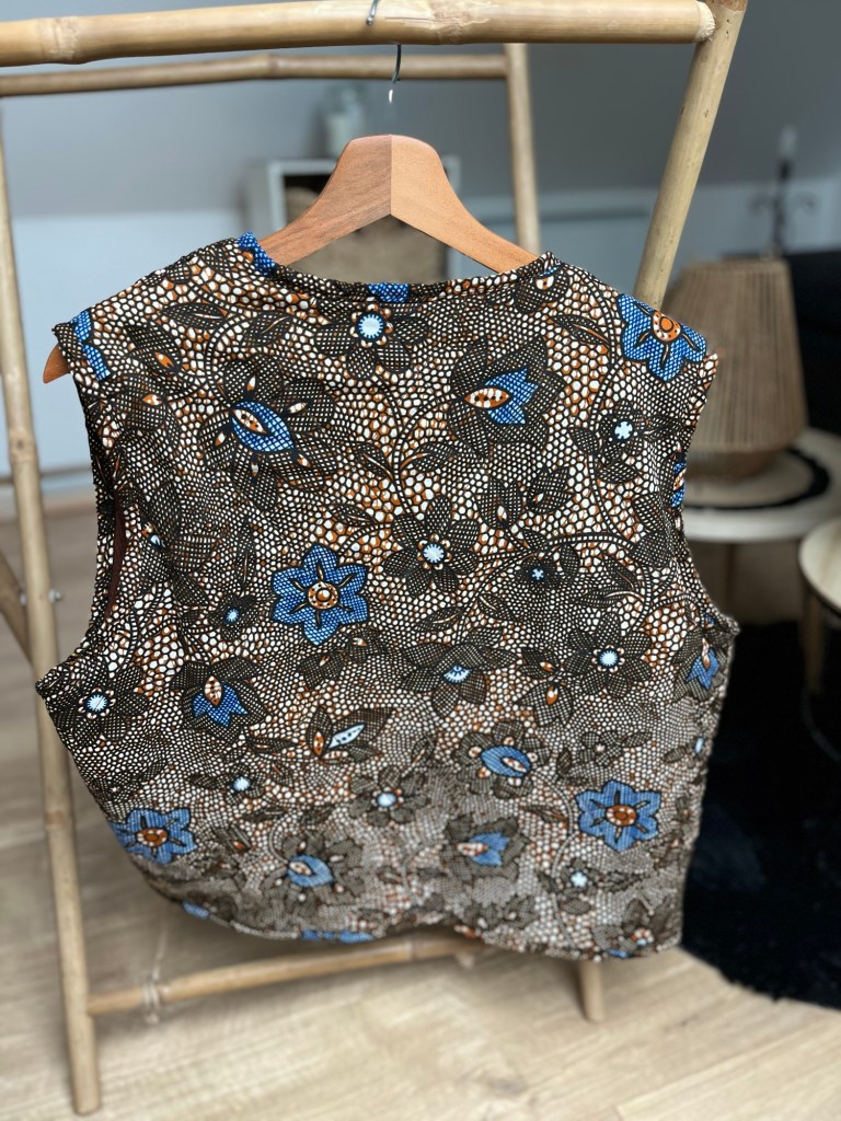 Et pour la touche finale (et parce que jâaime les petits dĂ©tails qui font tout), jâai choisi un biais en wax assorti. Oui, mĂȘme les finitions ont droit Ă leur moment de gloire !