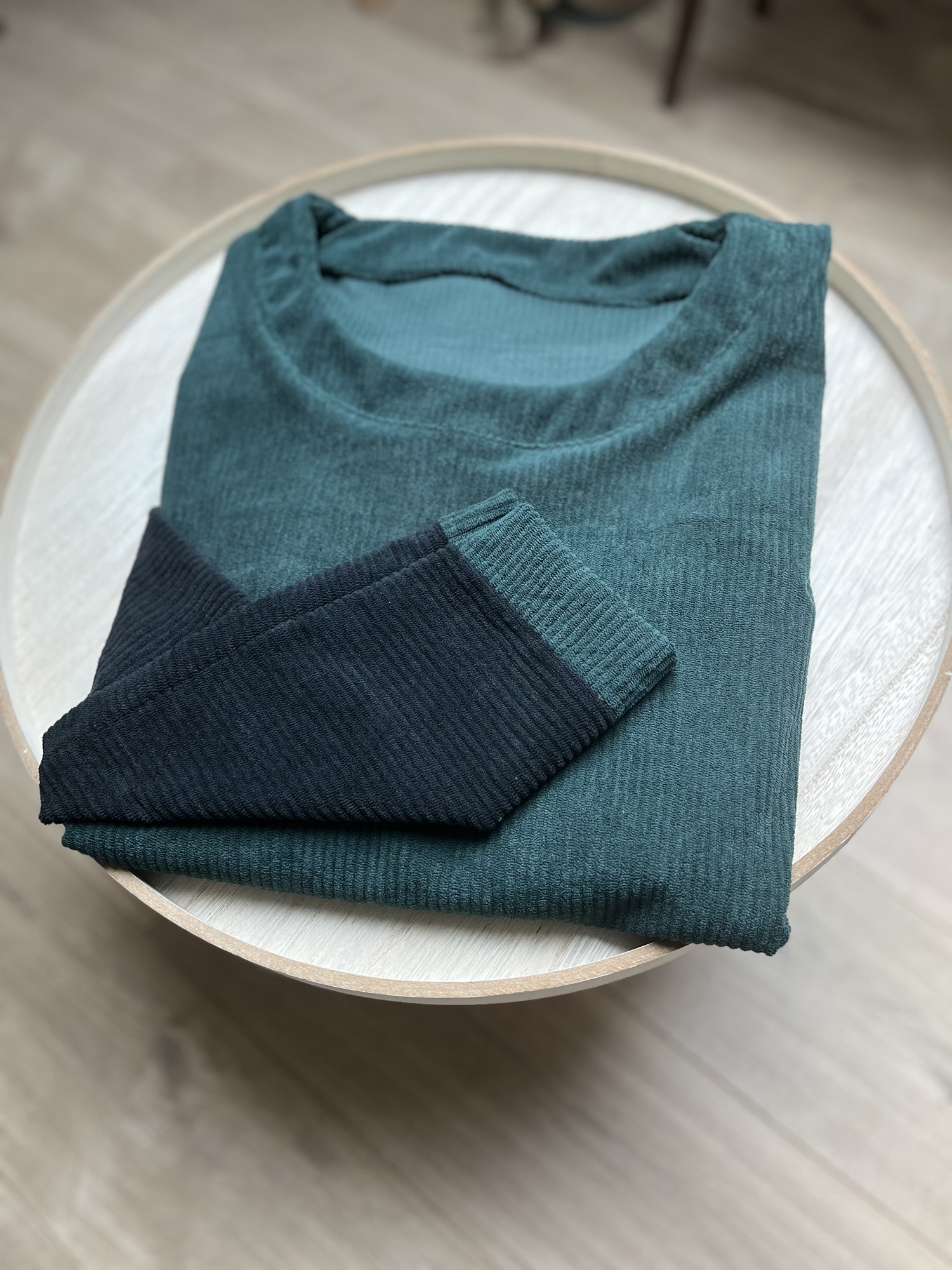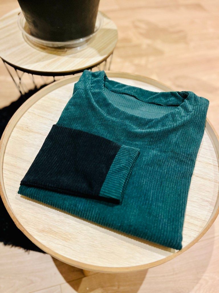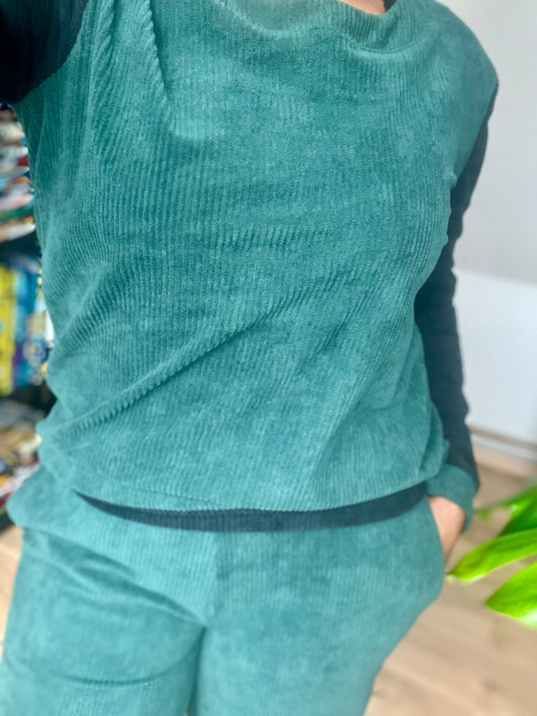 Faute d’avoir assez de tissu vert pour les manches – et pas assez de noir pour l’encolure ! – j’ai joué sur les rappels visuels. Le résultat ? Un pull bicolore harmonieux, moderne et original. Les bandes contrastantes ajoutées en bas permettent d’équilibrer parfaitement l’ensemble. C’est une belle preuve que les contraintes peuvent devenir un moteur de créativité !