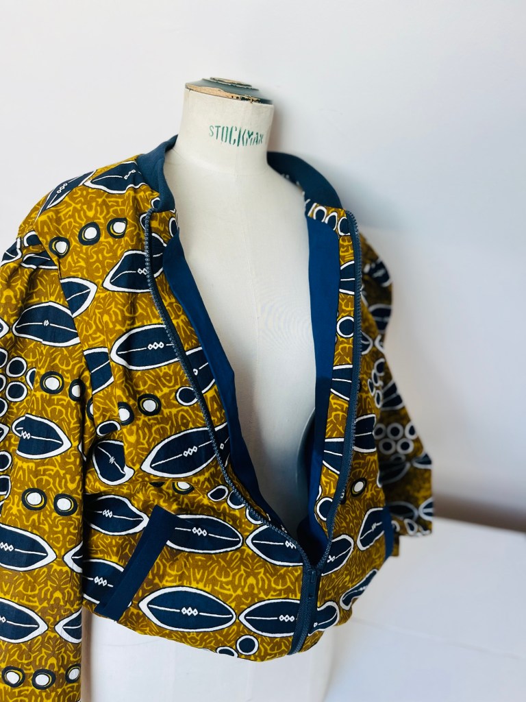 La doublure est un coton classique, simple et efficace. Pour structurer l’ensemble et apporter de l’équilibre visuel, j’ai opté pour un bord-côte et des poignets bleu marine. Ce contraste vient calmer l’intensité du wax tout en donnant une vraie finition au vêtement.